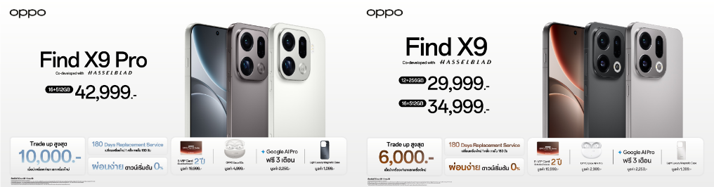 เป็นเจ้าของ OPPO Find X9 Series ได้แล้ววันนี้ โดย OPPO Find X9 Pro มาพร้อมความจุ 16+512GB ใน 2 สี ได้แก่ สีขาว Silk White และสีเทา Titanium Charcoal ในราคา 42,999 บาท ส่วน OPPO Find X9 มีให้เลือกสองรุ่นความจุ 12+256GB และ 16+512GB พร้อมมีให้เลือก 2 สี ได้แก่ สีเทา Titanium Grey และสีดำ Space Black ราคาเริ่มต้นที่ 29,999 บาท เปิดจำหน่ายพร้อมกันทั่วประเทศ ณ OPPO Brand Shop ทุกสาขาและตัวแทนจำหน่ายทั่วประเทศ พร้อมโปรโมชั่นสุดพิเศษช่วงเปิดตัว