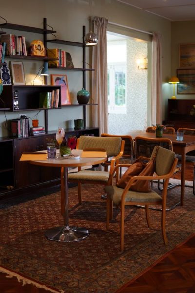 ฮันส์ยังเล่าถึงการออกแบบว่า “ดีไซน์ของบ้านหลังนี้สร้างขึ้นประมาณปี 60s -70s องค์ประกอบการออกแบบสะท้อนถึงชีวิตครอบครัวในแต่ละทศวรรษ—ตั้งแต่รุ่นคุณปู่ คุณพ่อคุณแม่ จนถึงรุ่นปัจจุบัน มีทั้งเฟอร์นิเจอร์วินเทจ งานศิลปะ ไปจนถึงงานศิลป์ร่วมสมัย การตกแต่งภายในจึงเหมือนบทเรียนเล็กๆ ในประวัติศาสตร์ ผมเลือกใช้สีโทนอ่อนจับคู่กับวอลล์เปเปอร์ลายจัดจ้าน สร้างบรรยากาศที่แปลกตาแต่ก็อบอุ่นและโปร่งสบาย มีโซนเลานจ์ที่ผนังตกแต่งด้วยไม้สีเข้ม พร้อมบาร์ค็อกเทลสไตล์ย้อนยุค ให้ความรู้สึกถึงยุค 70s ตัวบ้านเต็มไปด้วยงานศิลปะและของตกแต่งที่เติมความมีชีวิตชีวาและบุคลิกเฉพาะตัว