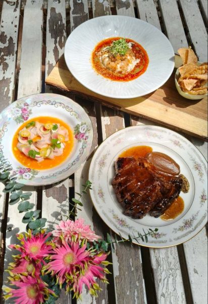 ● Ceviche – ปลากระมงรีดเลือด (Ikejime) จากสุราษฎร์ธานี แล่เสิร์ฟสไตล์ปลาดิบ ทานกับซอสที่ทำจาก Sea Buckthorn ซี บัคธอร์น (เบอรี่สีส้มสดจากชายฝั่งทะเลแถบยุโรป) และฝรั่งไส้แดง พร้อมส้มคัมควอท (ส้มจี๊ด) จากสวนบ้าน 94 เรียกคืนความสดชื่นและเปรี้ยวอมหวานแบบคลาสสิก