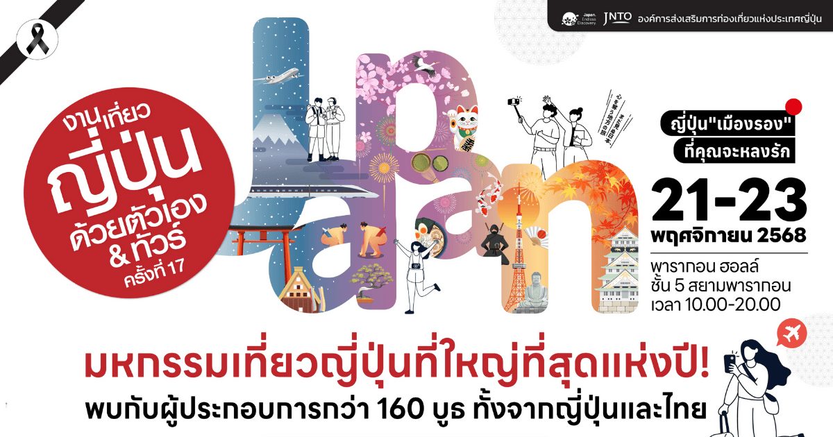 สายเที่ยวเตรียมตัวให้พร้อม เพราะมหกรรมท่องเที่ยวประเทศญี่ปุ่นที่ใหญ่ที่สุดในประเทศไทย ที่เหล่าสาวกเจแปนเลิฟเวอร์ตั้งตารอมากที่สุดกลับมาแล้ว! กับงาน “เที่ยวญี่ปุ่นด้วยตัวเอง & ทัวร์ ครั้งที่ 17” (Visit Japan FIT Fair #17) โดยองค์การส่งเสริมการท่องเที่ยวแห่งประเทศญี่ปุ่น (JNTO) สำนักงานกรุงเทพฯ ซึ่งครั้งนี้มาในธีม “ญี่ปุ่น ‘เมืองหลัก เมืองรอง’ ที่คุณจะหลงรัก” ที่คุณจะได้พบกับบูธกิจกรรมกว่า 160 บูธ รวมถึงโปรโมชันสุดพิเศษจากสายการบิน โรงแรม และทัวร์ญี่ปุ่นชั้นนำที่พาเหรดกันมาสานฝันคนอยากเที่ยวญี่ปุ่นให้เป็นจริง พร้อมกิจกรรมสุดคาวาอี้ ทั้งโชว์วัฒนธรรมญี่ปุ่น ทอล์กโชว์สุดสนุก ของพรีเมียมสุดคิ้วท์จาก JNTO และมินิคอนเสิร์ตสุดเซอร์ไพรส์จากเหล่าดารา–อินฟลูเอนเซอร์ชื่อดัง ที่จะมามอบความสนุกต่อเนื่องตลอดทั้งวัน แล้วพบกันวันศุกร์ที่ 21 – วันอาทิตย์ที่ 23 พฤศจิกายน 2568 ณ พารากอนฮอลล์ ศูนย์การค้าสยามพารากอน ชั้น 5