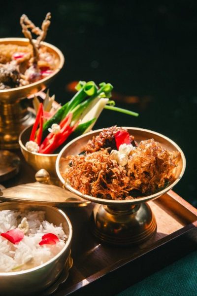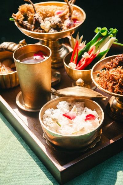 ข้าวแช่ จิม ทอมป์สัน นำเสนอข้าวหอมมะลิไทยที่นึ่งด้วยวิธีดั้งเดิม เสิร์ฟพร้อมน้ำลอยดอกไม้ออร์แกนิกในชามทองเหลืองอันงดงาม ข้าวแช่มาพร้อมเครื่องเคียง 7 ชนิด ได้แก่ ลูกกะปิชุบไข่ทอด ไชโป๊วหวาน พริกหยวกสอดไส้หมูคุโรบุตะห่อไข่ลูกไม้ ปลาช่อนแดดเดียวยัดไส้หอมแดง หมูฝอย พริกแห้งไส้ปลาหวาน และ ปลายี่สนหวาน นอกจากนี้ยังเสิร์ฟผักและผลไม้แกะสลัก ปิดท้ายด้วยของหวานซิกเนเจอร์อย่าง ส้มฉุนลูกหม่อนลิ้นจี่มะยงชิด